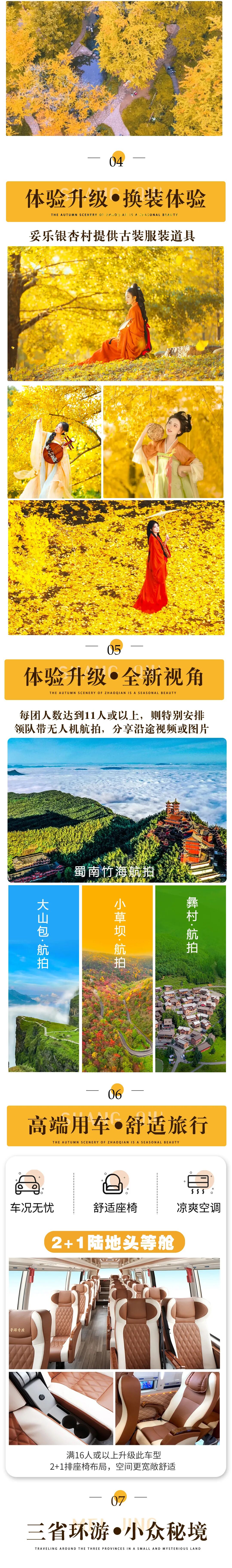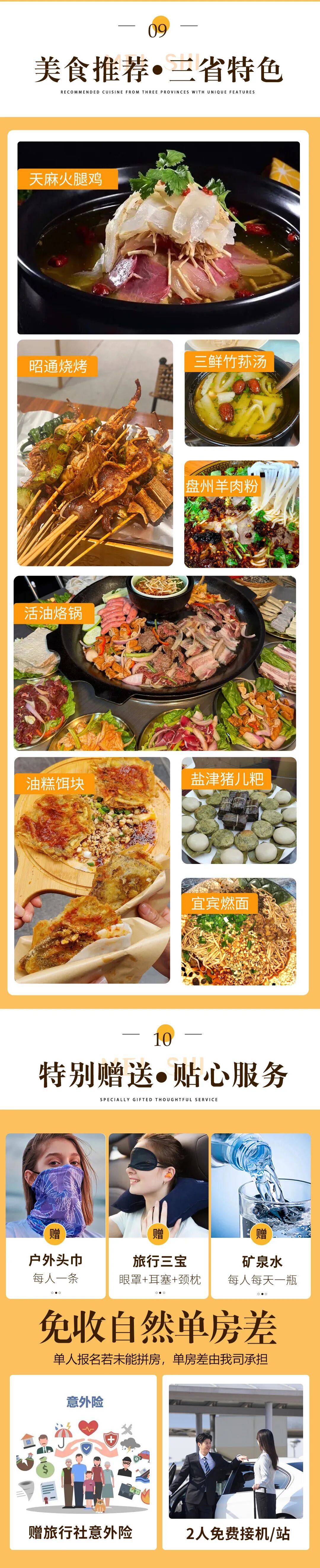 3.【秘境网红】1)网红与秘境全打卡:雨碌大地缝+大山包云海+网红盐津县城+小众宜宾+小草坝秋色+网红九洞天+妥乐银杏秋色;2)景点元素丰富:高山、草甸、云海、湖泊、竹海、红叶、黄叶、峡谷、河流、古镇、古村全汇集;3)一趟旅程,云贵川三省环游,品味三省美食及文化差异;