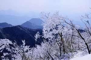 过杏梅坞,继续向上,树丛越来越密,大有林海雪原的感觉。树枝上覆盖着晶莹剔透的霜雪,近观玉树凌空,琼花烂漫;远望,白茫茫一片,仿佛上一秒还是漫天飞雪。