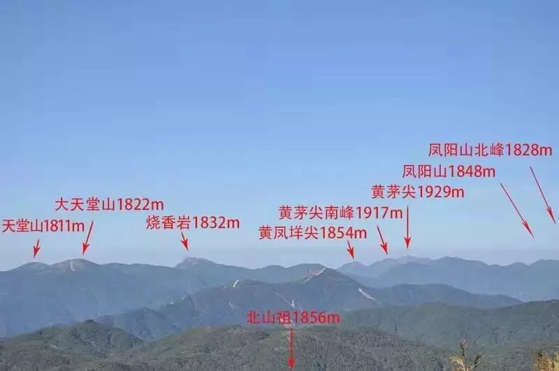 11座山峰依次为:凤阳山(北峰1828米)、凤阳山(1848)、黄茅尖(1929)、黄茅尖南峰(1917)、黄凤垟尖(1854)、烧香岩(1832)、天堂山(1811)、大天堂(1822)、百山祖(1856)、牛路尖(也称新兰尖1828)、荒村尖(1810)。