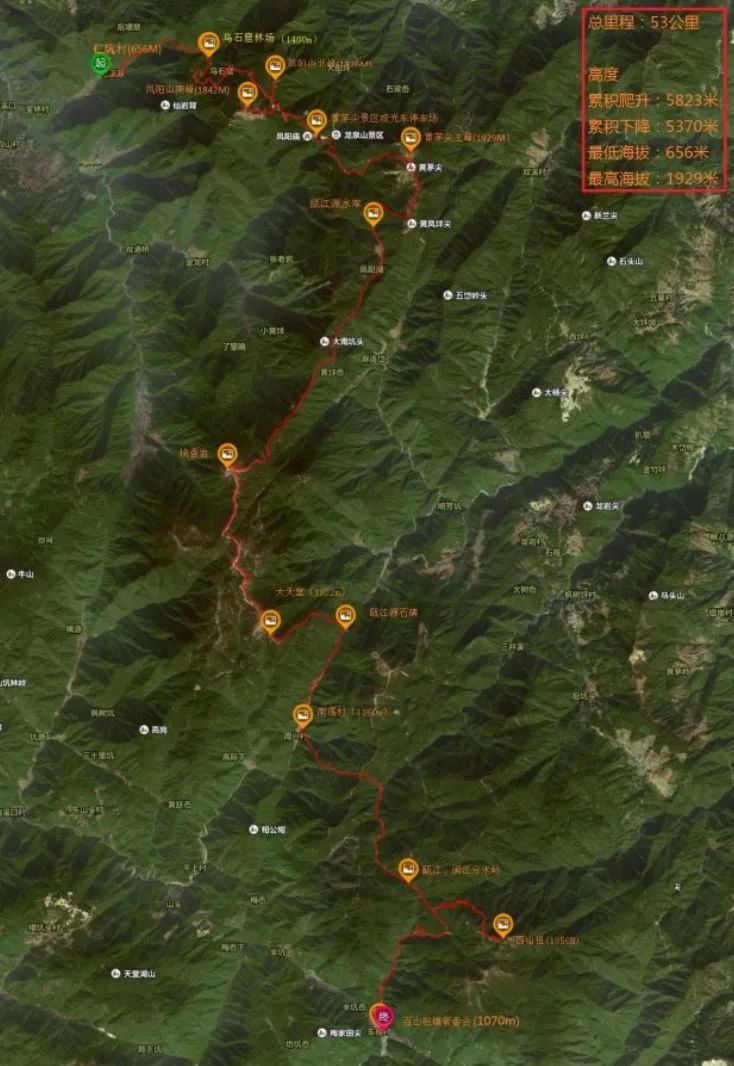 粗坑村—废弃林场—凤阳山北峰(1828)—凤阳山(1848)—黄茅尖(1929)—黄茅尖南峰(1917)—黄凤洋尖(1854)—烧香岩(1832)—天堂山(1811.4)—大天堂(1822)—瓯江源碑—南溪村—(锅冒尖)茶木於—百山祖(1856.7)—茶木於—龙泉