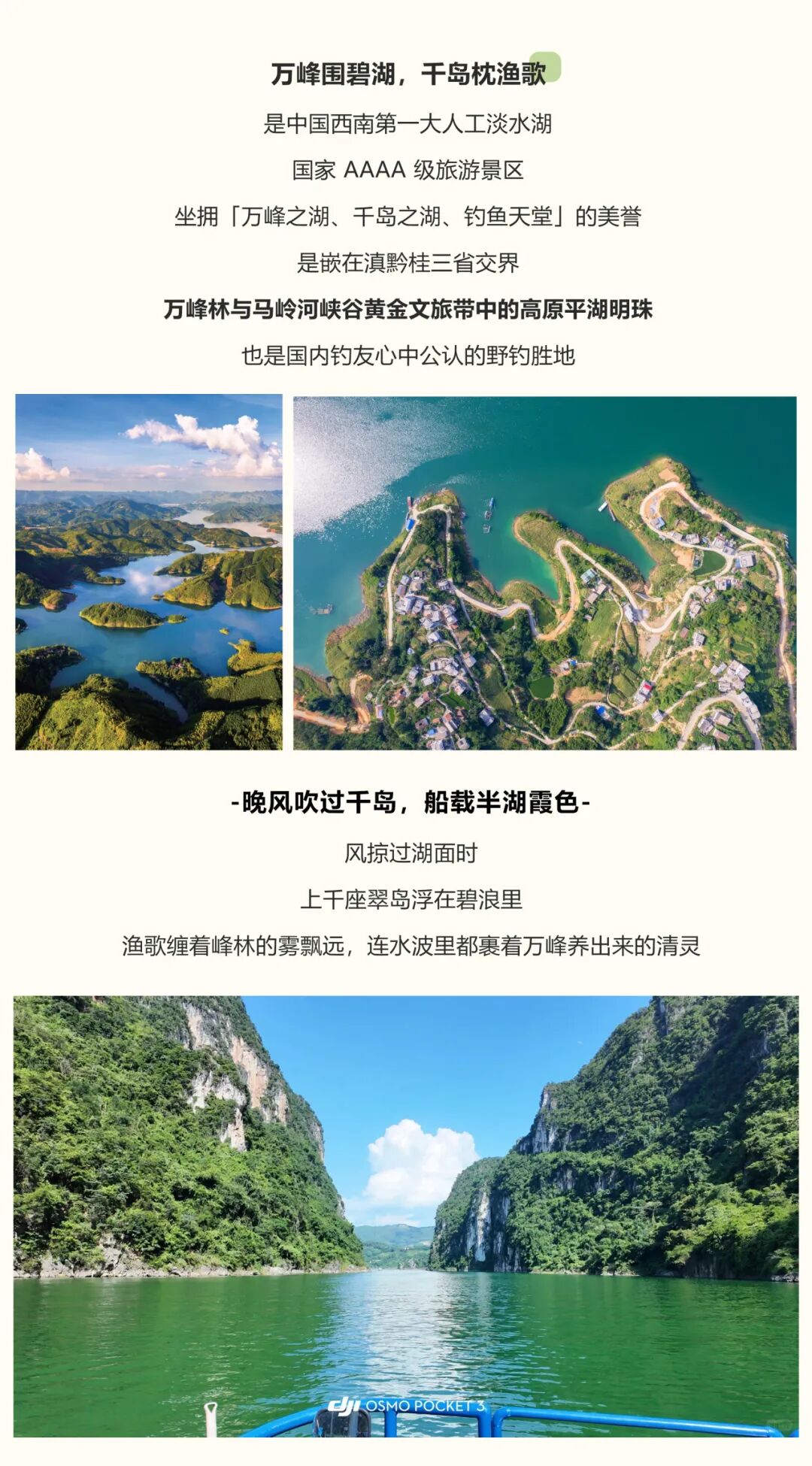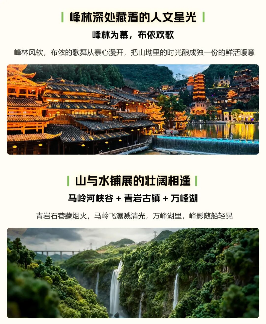 上午 乘车前往【万峰湖】,这是一个如诗如画的地方,湖光山色交织成一幅绝美的画卷。晨曦时分,湖面被朝霞染成金黄色,波光粼粼;夕阳西下,湖水与天空融为一体,美不胜收、层峦叠嶂、峰峦秀丽、四季景色各异。春季山花烂漫,夏季山峦翠绿,秋季层林尽染,冬季银装素裹。一年四季都可以感受大自然的鬼斧神工,您将沉醉于这如诗如画的美景之中。
