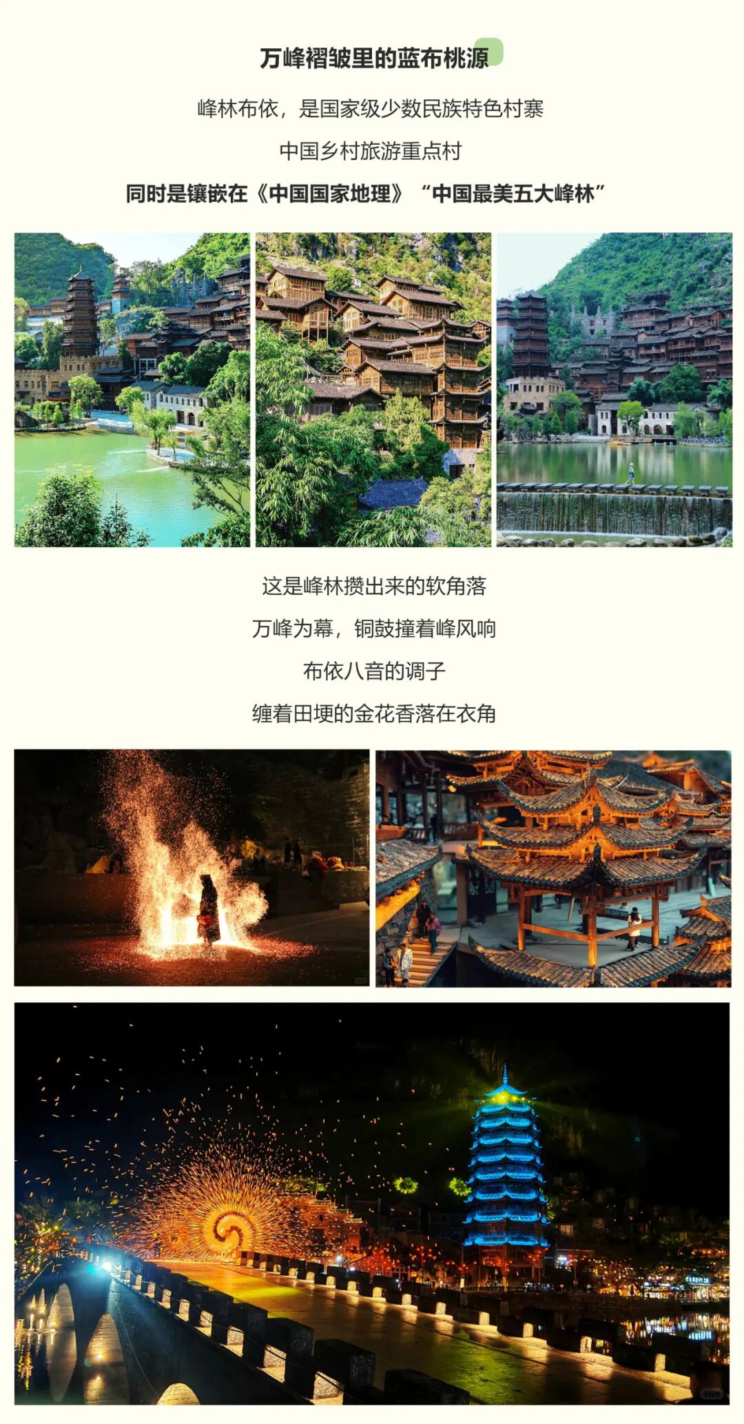 下午乘车前往【峰林布依寨】,走进峰林布依景区,犹如走入一幅布依族生活长诗。勒尤湖和浪哨湖两岸依山而建的布依族建筑,古朴自然。对歌长廊上,阿哥阿妹隔人海对唱《浪哨》,婉转歌声,诉尽布依儿女绵绵情意;台上,形式活泼、风格质朴的布依戏唱响,古老的布依族故事荡漾在街区;沿街店铺里,镌刻着花鸟鱼虫、草木藤蔓的刺绣服饰,工艺精湛的布依三维草编,更有打铁花和当地特色婚俗等民族表演,令人应接不暇。