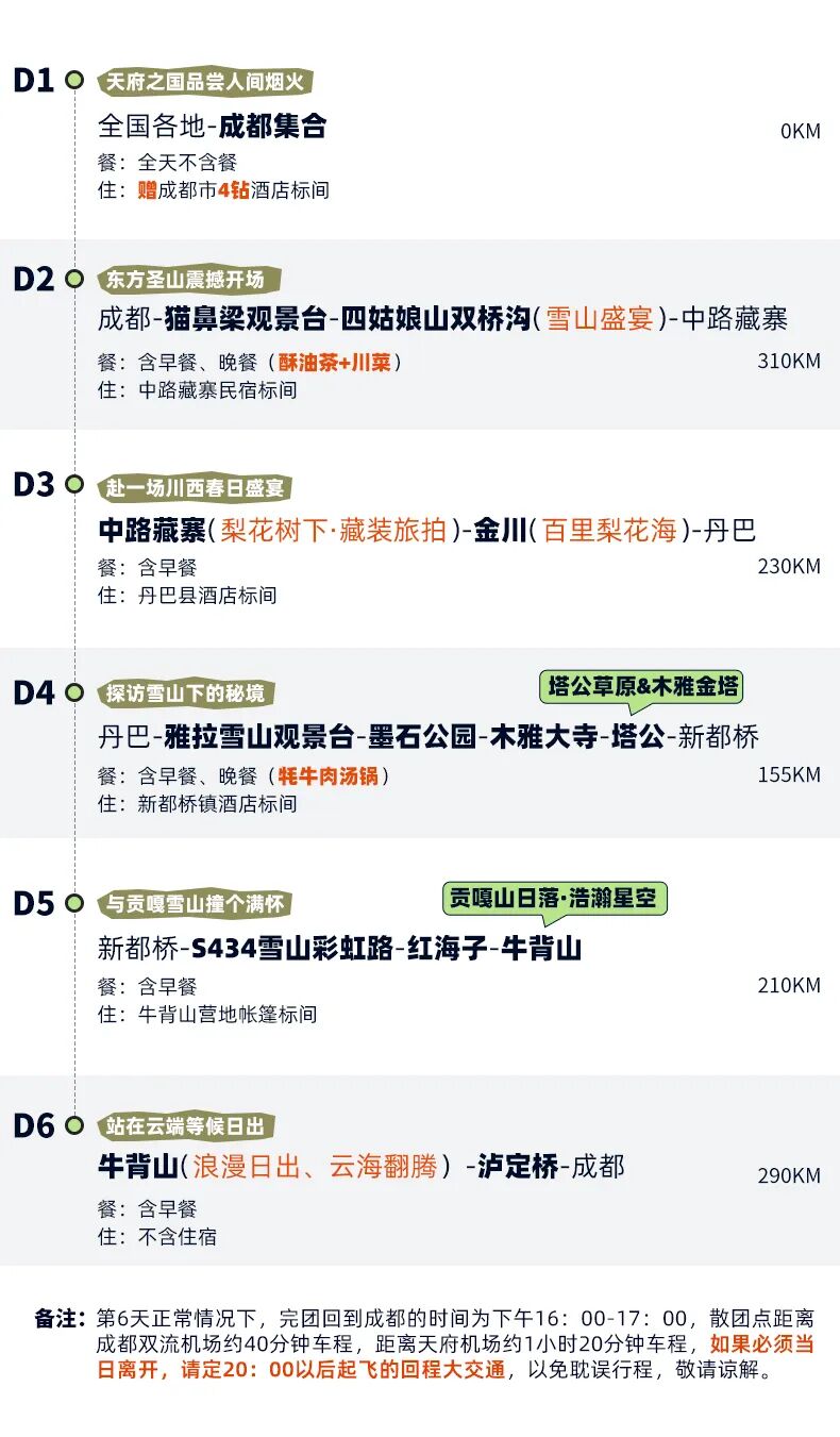 春染川西活动!保成行!请先报名,客服确定团期余位后,再购买大交通 去程:D1 全天成都集合 回程:D6 最后一天成都返程,请订购,20:00以后起飞的航班