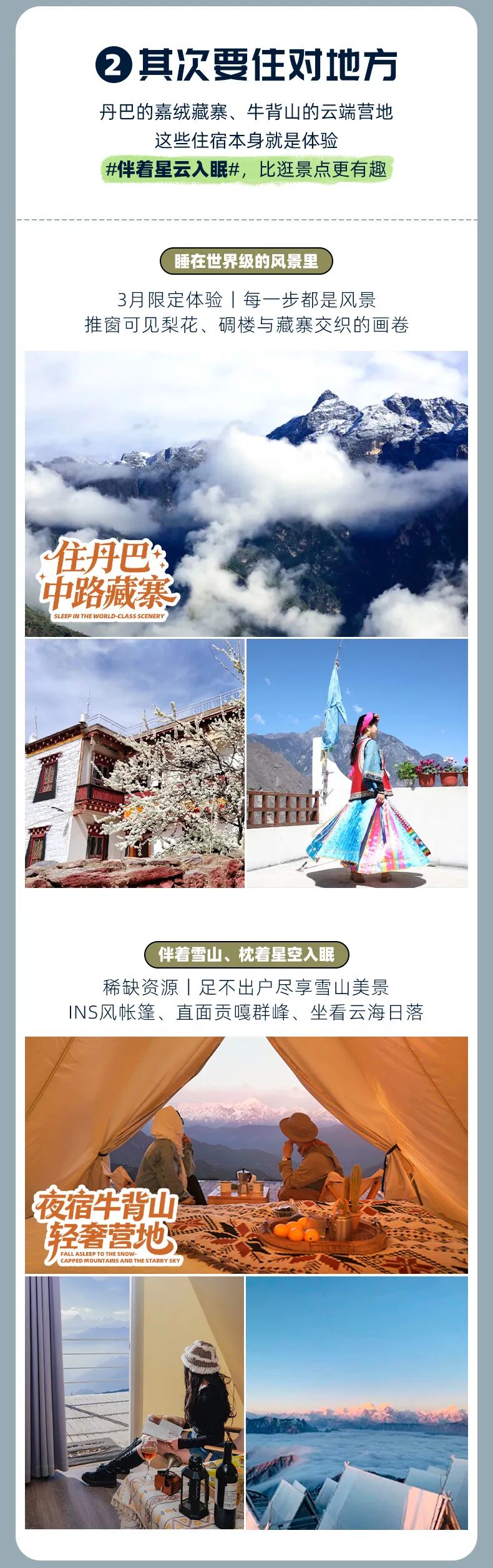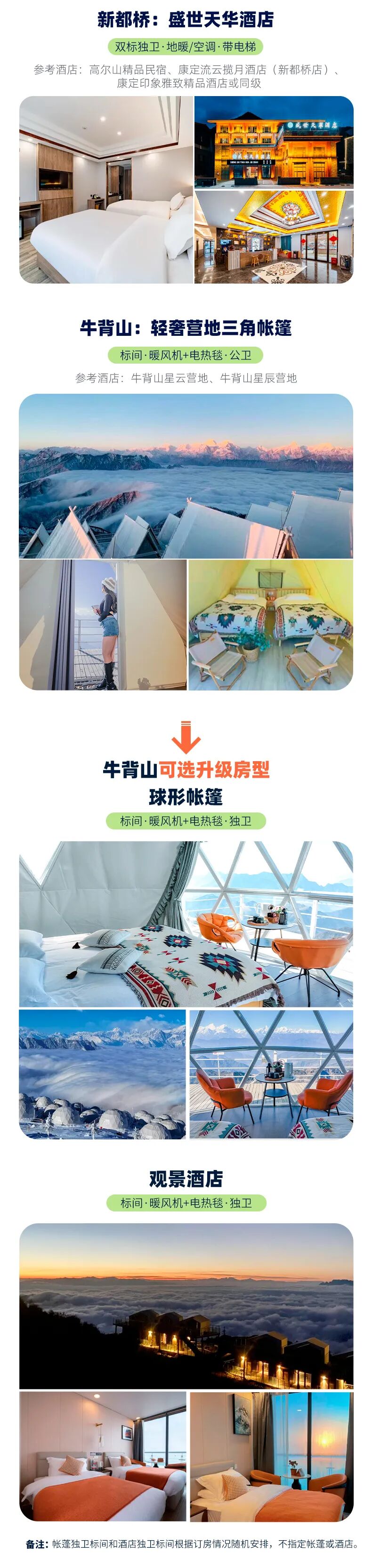 牛背山升级球形帐篷(独卫)/酒店(独卫)2人标准间,3430元/人,单房差1150元/人。