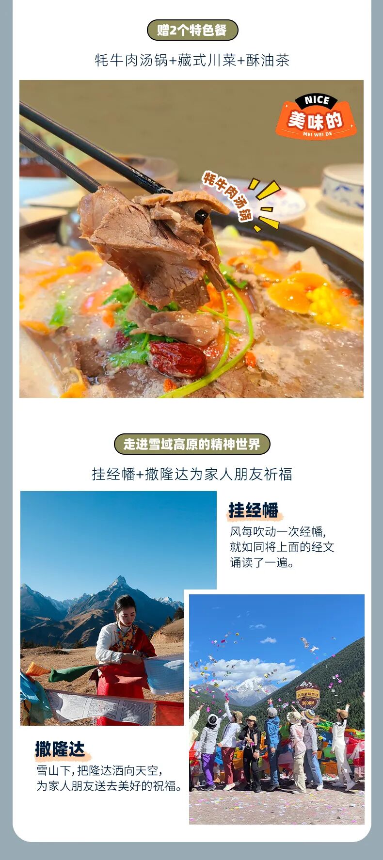 3、全程5早餐+2正餐(酥油茶+藏式川菜、牦牛肉汤锅),如队员另外点餐,需自己支付费用;