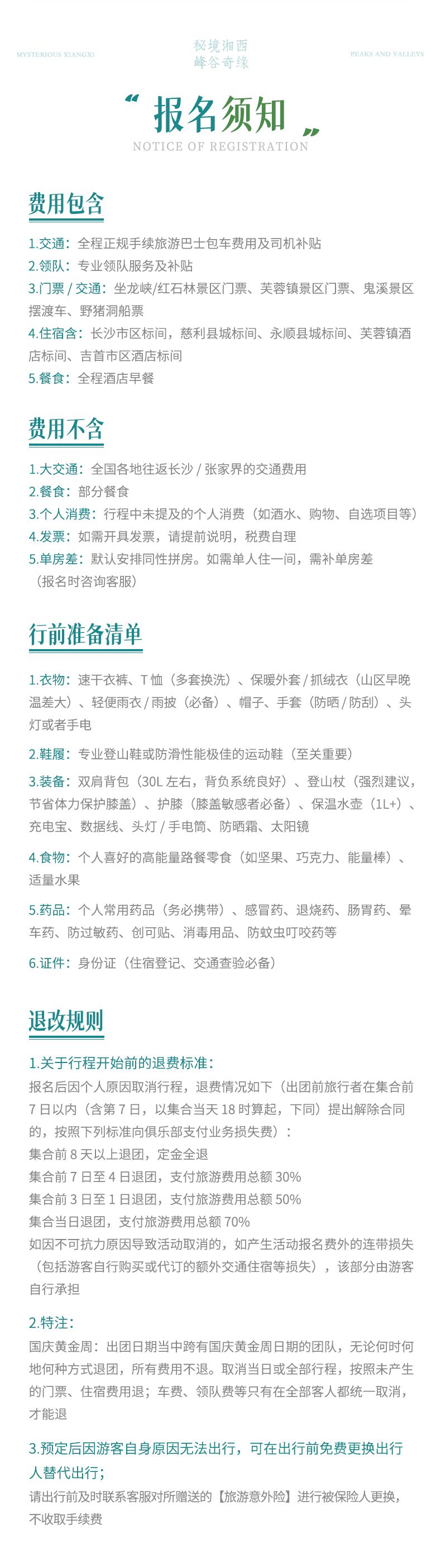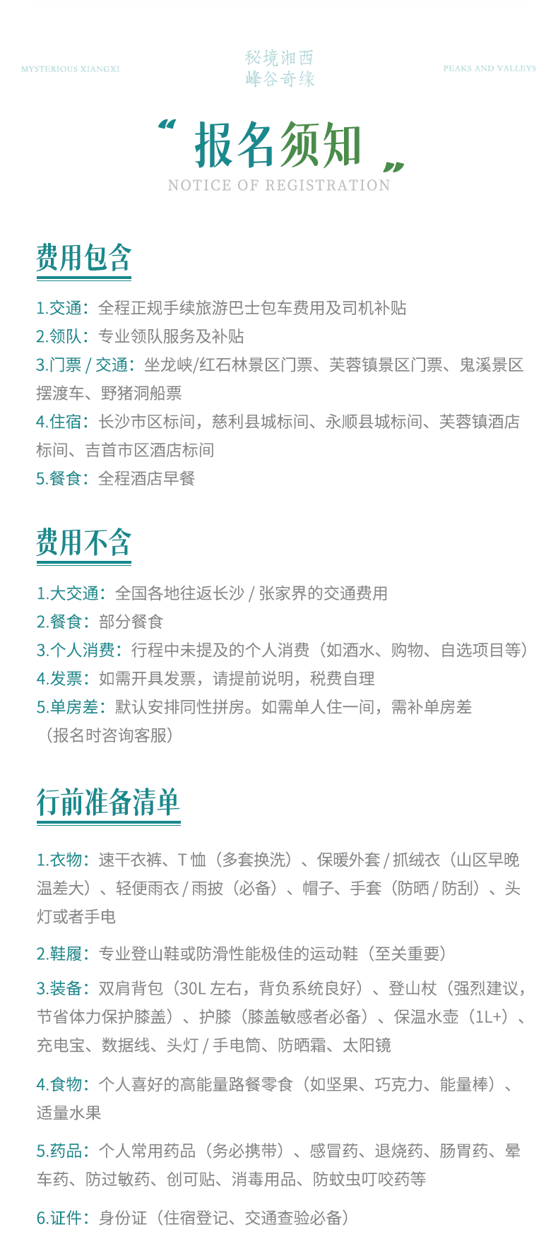 湘西徒步活动!保成行!请先报名,再购买大交通 去程:2026.4.11 全天长沙集合 回程:2026.4.16 最后一天吉首东高铁站,建议购买14:00以后的高铁票,长沙南高铁站,请购买20:00以后的高铁票。