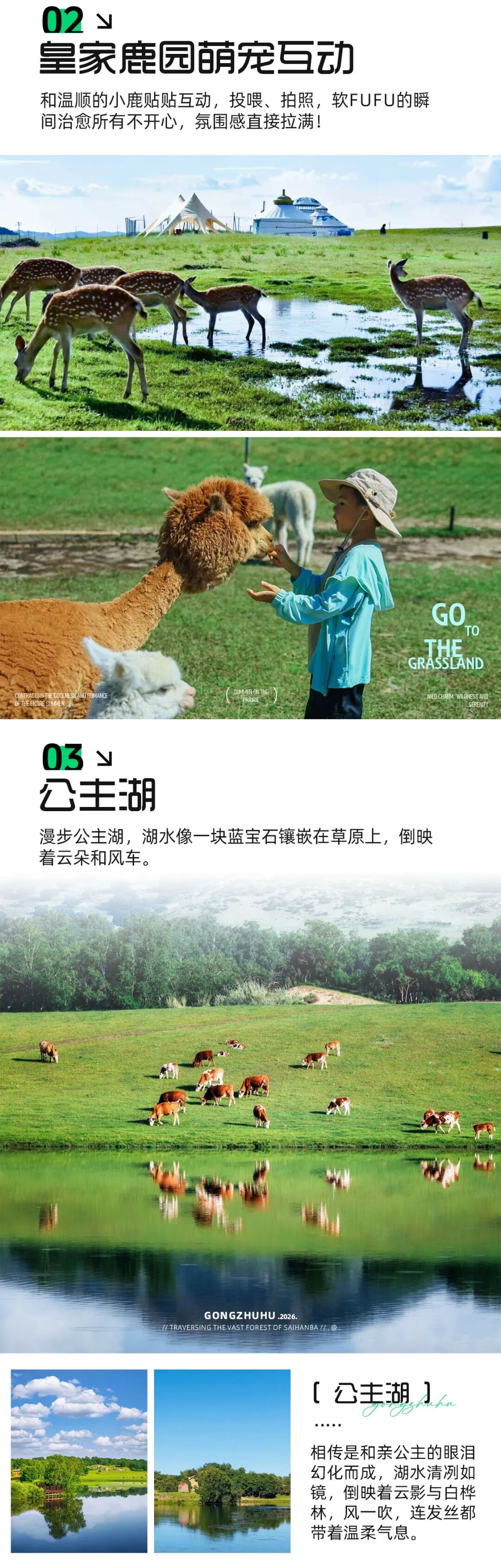 ·下午:开始游览行程:皇家鹿园萌宠互动-草原明珠公主湖水光云影-专业马场骑马体验-晚上品正宗炭烤全羊,参加小型篝火;