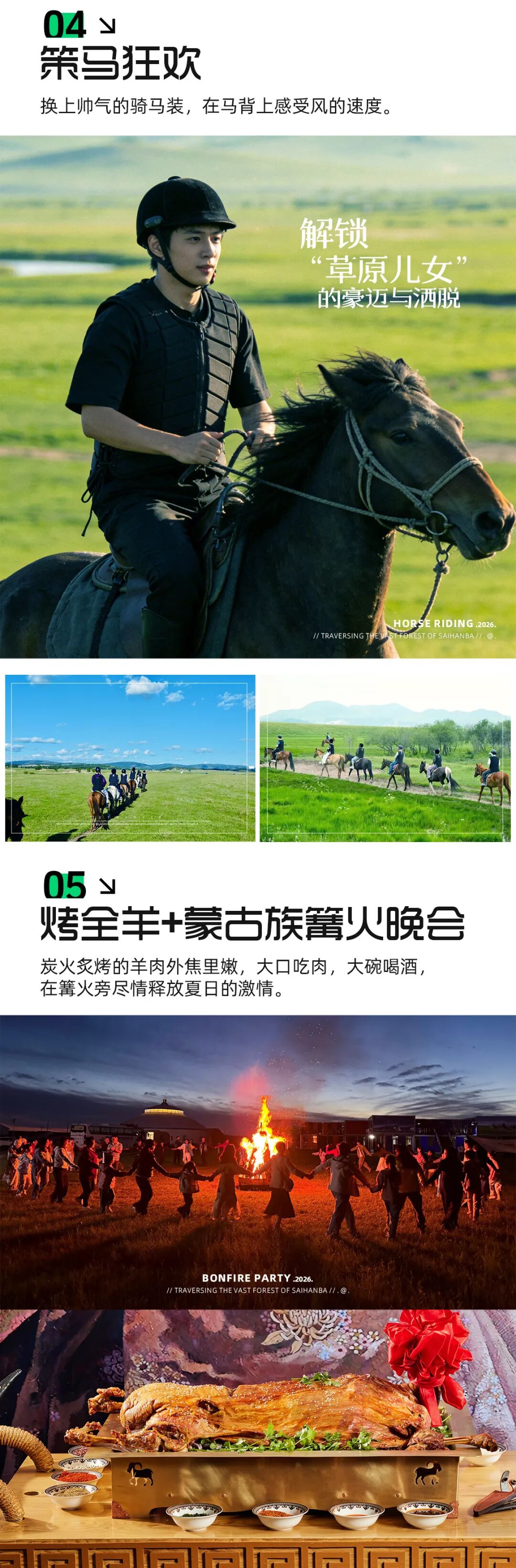 ·烤羊篝火:蒙古族传统中,烤全羊是游牧生活的核心饮食,元代已有“掘地为坎以燎肉”的原始烧烤方式,清代成为蒙古族王府待客礼制名菜,“外皮金黄酥脆如焦糖,内里鲜嫩多汁似春芽”—烤全羊色泽黄红油亮,皮脆肉嫩,肥而不腻。晚上参加小型篝火晚会,观星河璀璨。