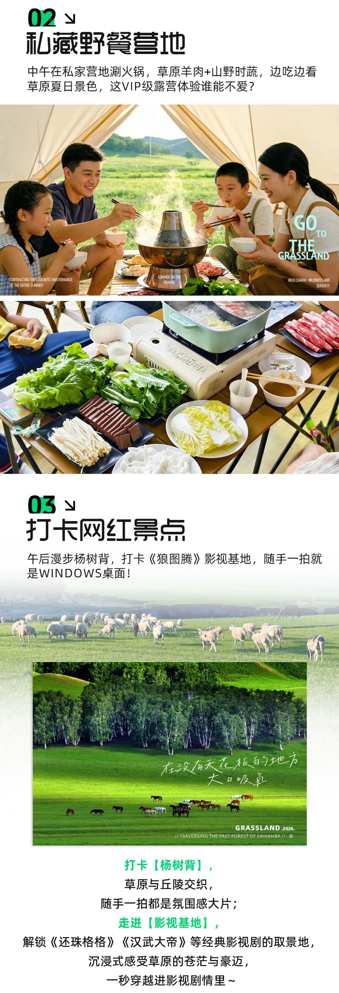 ·下午私享时光:在“私家营地”体验草原火锅野餐,杨树背大牧场偶遇牛羊群,漫步“影视基地”网红木栈道;