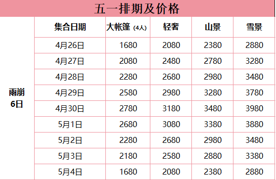 备注:以上价格仅区别雨崩村三晚住宿;丽江、飞来寺 住宿一致 。
