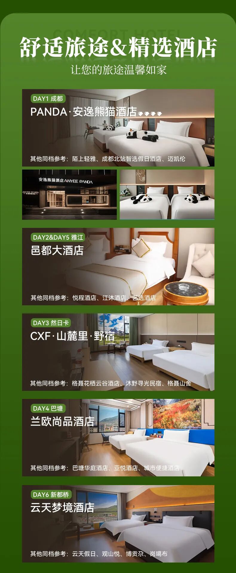 ● 住宿:按行程所列标准入住:6晚酒店住宿(详情请参见行程安排,成都集合日酒店为赠送,不用不退)