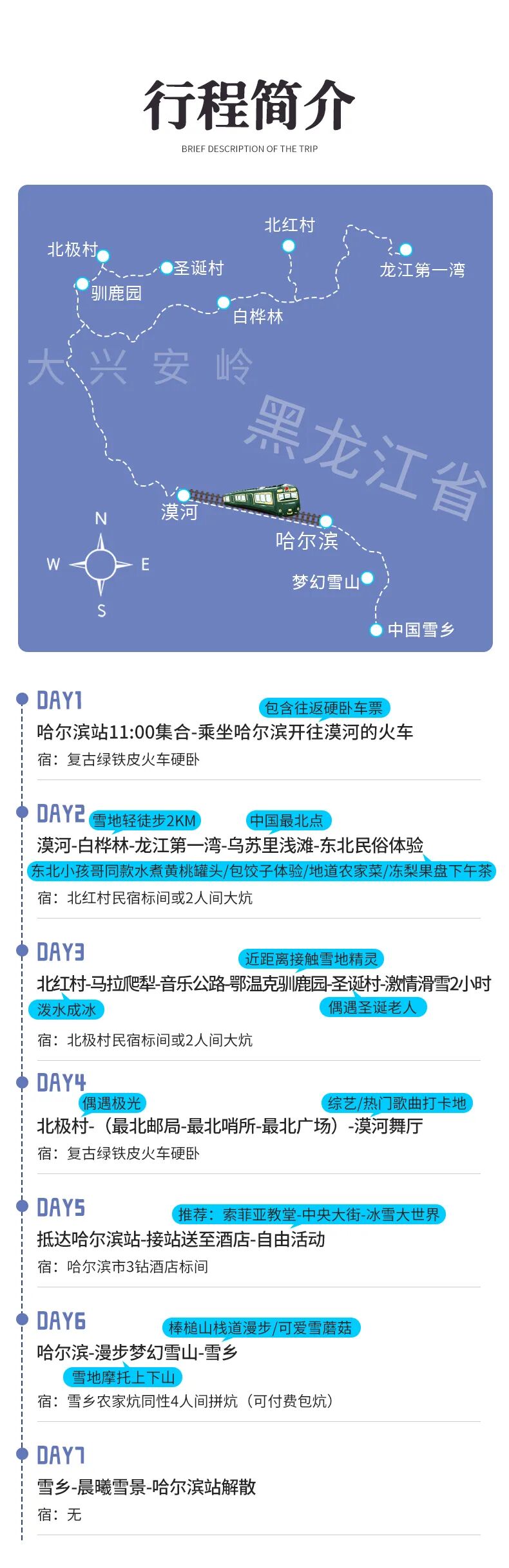 2、用餐:包含4顿早餐(D6早餐打包),火车上用餐请自行准备食物3、用车:D1-D4(漠河段):5座SUV,2-4客人一车(小团副驾驶及前后座位置需要轮流乘坐,望悉知)D5:哈尔滨火车站接站送您至酒店办理入住(一般为下午两点以后入住,如过早抵达可寄存行李),随后自由活动无用车服务D6-D7(雪乡段):2-3客人用5座SUV,4-5客人用7座商务车,6客人用9座商务车,7-8客人用15座商务车(小团副驾驶及前后座位置需要轮流乘坐,望悉知)4、门票:雪乡门票+往返环保车、梦幻雪山门票、龙江第一湾门票、圣诞村门票、漠河2小时滑雪(包含雪鞋雪板雪杖)、北极村门票、鄂温克驯鹿园;5、领队:司机兼管家,帮助大家购买门票,给团友游玩建议,无法全程陪同进入景区和提供专业讲解等服务,敬请谅解;6、火车:哈尔滨-漠河往返火车硬卧(铺位随机,一起报名的小伙伴尽量安排同一节车厢,但冬季票务紧张无法保证,建议提前15天以上预定,15天以内报名请现询是否有票)