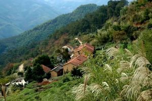 2个半小时后进入山路。山路弯弯,绕过几道“之”字形弯,便上到海拔500米左右的一个村庄。远远看去,对面一个布局在山坡上的村庄,白墙红瓦,颇可以入画。