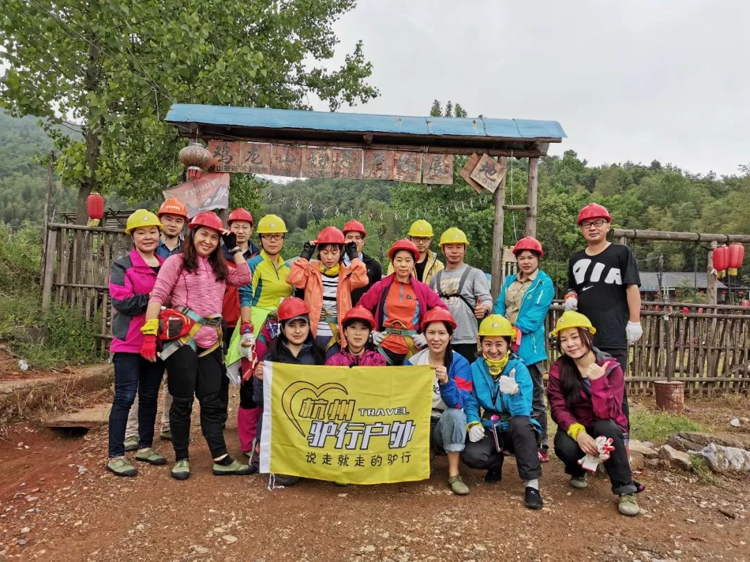 早上07:30打铁关地铁站A口准时集结出发,杭州驴行户外黄色旗帜,各自怀着惴惴不安的心情踏上这次的探险之旅,途中领队引导大家互动、互相介绍熟悉,09:30分左右到达桐庐纪龙山入口处,伸展身体后大家开始整理装备出发,土路徒步半小时左右就到了金牛洞,洞内空旷,但没有光线,虽不是我们要探洞的主角,但也可以提前感受下探洞的刺激,洞内出来,穿过树林,步行一小时就到达速降地点,在农家吃午饭。