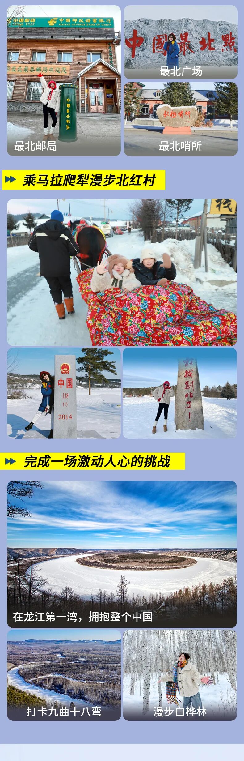 北极村-最北邮局-最北哨所-最北广场-九曲十八弯/白桦林-漠河舞厅-漠河(90KM,车程约1.5小时)-哈尔滨