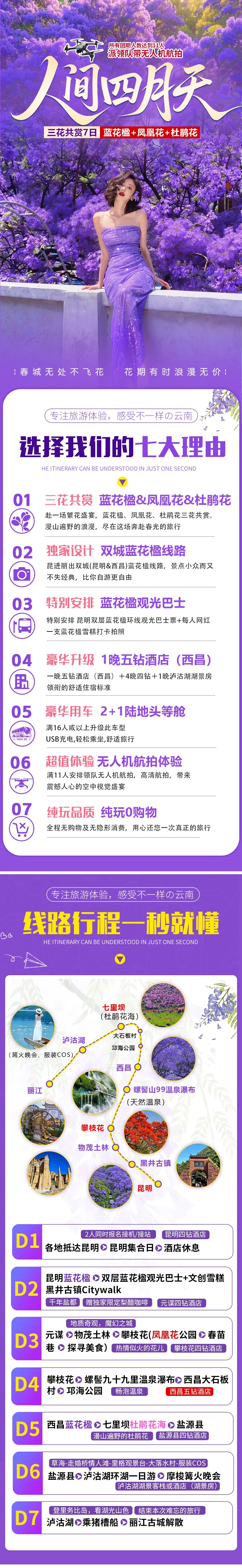 <蓝花楹+凤凰花+杜鹃花>昆明&西昌双城蓝花楹、元谋土林、黑井古镇、攀枝花凤凰花、邛海公园、大石板村、99里温泉瀑布、七里坝杜鹃花海、风情泸沽湖 7日深度之旅(无人机航拍 | 满16人升级2+1陆地头等舱 | 摩梭篝火晚会 | 升级1晚5钻酒店 | 梨醋咖啡 | 双层蓝花楹巴士+文创雪糕 | 民族服装COS | 单人保证拼房)