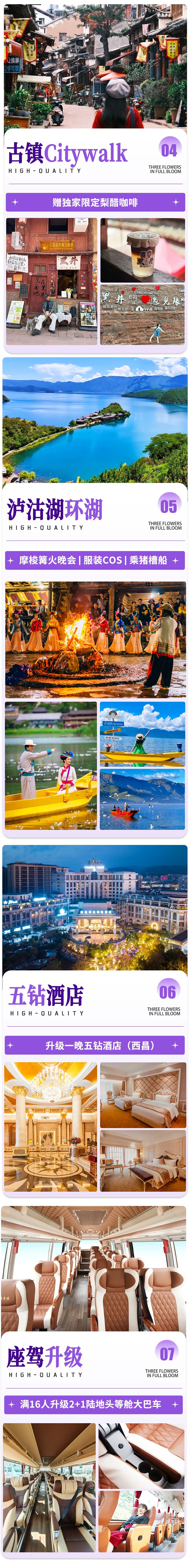 【旅行体验】:特别安排昆明双层蓝花楹环线观光巴士票+每人网红一支蓝花楹雪糕打卡拍照+黑井盐都限定梨醋咖啡一杯+99里网红温泉票+泸沽湖篝火晚会+泸沽湖服装cos