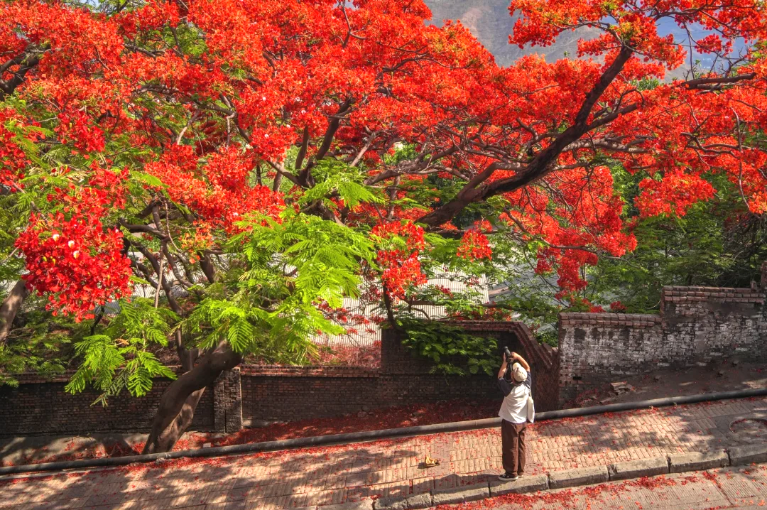 随后来到【春苗巷】,巷子保留着老攀枝花的烟火气,凤凰花下是居民楼、小卖部,复古又治愈,超有生活感!街道两旁火红一片,随手拍都是花海大片,能近距离感受到一种叫"满街凤凰燃成烈火"的震撼。