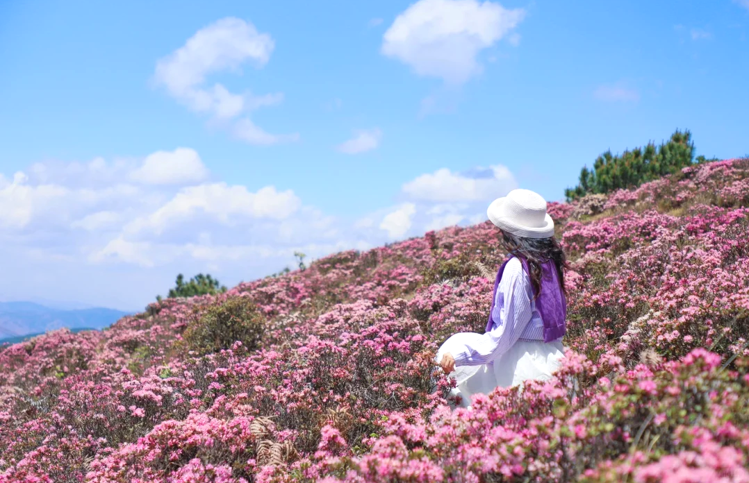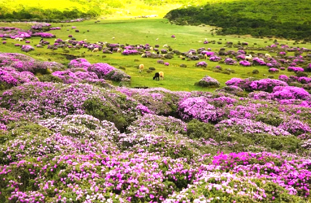 适时前往【七里坝草场】。行驶约40公里的蜿蜒盘山公路顺利到达昭觉“谷克德”七里坝,这里海拔高度近3500米,是一片壮观的高山草甸,生长在这里的杜鹃花品种繁多,包括乔木和灌木。其中,乔木杜鹃以白色、绯红偏多,灌木杜鹃颜色主要为紫色及紫蓝等色。每年4一5月杜鹃花开季节,盛开的杜鹃花,一簇簇、一片片,红的像霞、白的像云;远处的游人沐浴着阳光,在草甸上,在花海里自由的嬉戏……天却是那么的近!山顶高处花儿越多越密开得越艳丽,繁花似锦,铺天盖地,一片生机勃勃的景象,令人神往。
